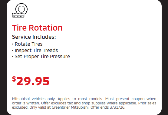 Mitsubishi vehicles only. Applies to most models. Must present coupon when order is written. Offer excludes tax and shop supplies where applicable. Prior sales excluded. Only valid at Greenbrier Mitsubishi. Offer ends 3/31/26.